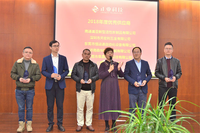 隨后,為表彰過去一年為正業(yè)科技的發(fā)展作出突出貢獻的供應商朋友,正業(yè)科技進行優(yōu)秀供應商頒獎,此次獲得正業(yè)科技2018年度優(yōu)秀供應商的是:南通美亞新型活性炭制品有限公司、深圳市天宏利五金有限公司、東莞市恒運通自動化設備有限公司、濟南森華精密機械有限公司、東莞市阜晟電子科技有限公司。正業(yè)科技物業(yè)管理部總監(jiān)吳國芳為優(yōu)秀供應商頒發(fā)獎牌。