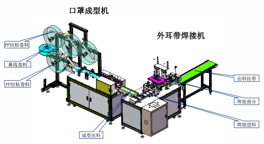 本設(shè)備主要生產(chǎn)平面口罩,由口罩成型機(jī)和外耳帶焊接機(jī)組成。從原材料卷料自動(dòng)送料、鼻線插入、截?cái)唷⒊暡ㄈ酆稀⒖谡肿詣?dòng)裁斷、耳帶上料及焊接等均全自動(dòng)完成。