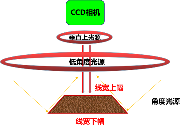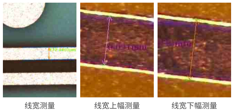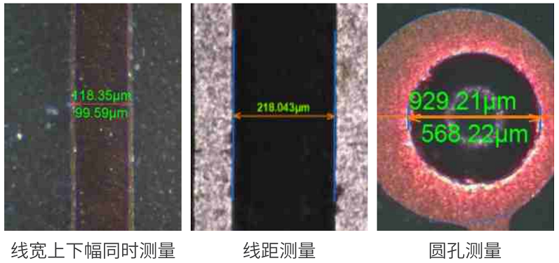 通過影像成像系統(tǒng)及光源從上表面垂直于被測板,呈顯影像(相機(jī)實(shí)時(shí)拍圖)感測,并將圖像傳送至電腦測量軟件,通過軟件測量工具分析圖像的“線寬/線距/線寬上下幅/圓/金手指線寬等”標(biāo)準(zhǔn)公差值對比,從而判斷被測板上的測量值OK或NG。