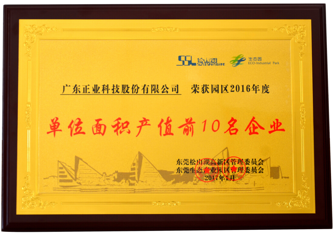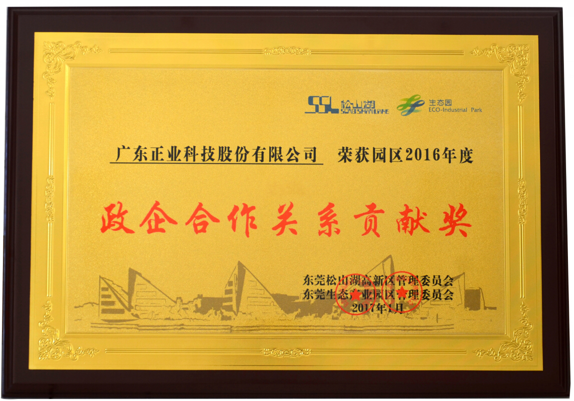 2017年1月,由廣東省東莞市松山湖管委會(huì)發(fā)布信息,廣東正業(yè)科技股份有限公司獲評(píng)松山湖(生態(tài)園)2016年度先進(jìn)工作單位,共入選“2016年度園區(qū)政企合作關(guān)系貢獻(xiàn)獎(jiǎng)”(共5家)、“2016年度園區(qū)單位面積產(chǎn)值前10名企業(yè)”(共10家)和“2016年度園區(qū)‘十佳敬業(yè)奉獻(xiàn)好人’” 三個(gè)評(píng)選項(xiàng)目。
