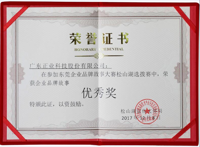正業科技市場中心撰寫的《風雨同舟攜手廿載,匠心智造鑄就未來》,以正業科技20年歷程為藍本,講述正業科技自主創新走民族品牌之路的故事,榮獲“東莞企業品牌故事大賽”松山湖選拔賽優秀獎。